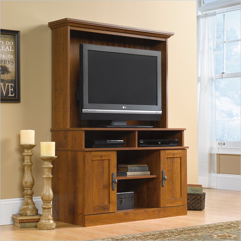 Sophisticated hardware decorates doors and drawers. The cabinetry design is classic and clean for media, display and storage. All pieces feature modern technology solutions while maintaining the irresistible warmth and mood with the golden tones of our new Abbey Oak finish. Features: -Harvest mill collection. -Abbey oak finish. -Holds TV weighing 95 lbs or less. -Cubby hole storage features one adjustable shelf holds audio and video equipment. -Storage area behind doors holds DVDs and CDs. -Made in USA. -Manufacturer provides 5 year warranty. -TV opening dimension: 28.5" H x 39" W.